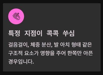 셋째, 한쪽만 유독 아프거나 특정 지점이 콕콕 쑤시는 경우도 있습니다. 이런 경우는 걸음걸이, 체중 분산, 발 아치 형태(평발/요족) 같은 구조적인 요소가 영향을 주기도 합니다.