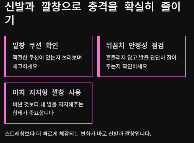- 신발/깔창을 점검해서 충격을 줄이기