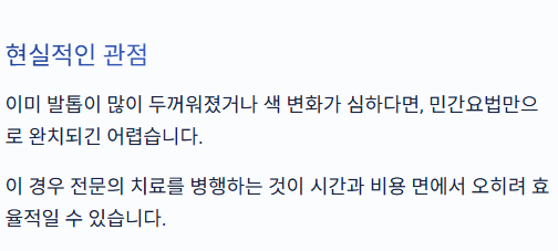 이미 발톱이 많이 두꺼워졌거나 색 변화가 심하다면, 민간요법만으로 완치되긴 어렵습니다. 이 경우에는 전문의 치료를 병행하는 것이 시간과 비용 면에서 오히려 효율적일 수 있습니다.